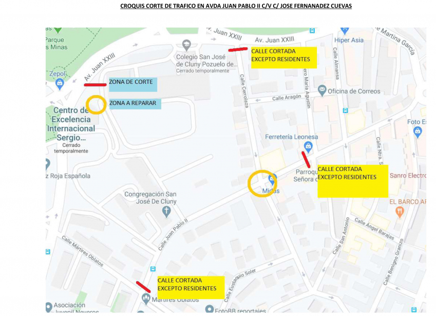 Por otra parte, el Ayuntamiento también informa que a partir del lunes 18 de mayo y hasta fin de obra se procederá a cortes de tráfico en la Avenida Juan Pablo II. Así, con motivo de la reparación urgente del saneamiento en Avda Juan Pablo II c/v C/ Jose Fernandez Cuevas, debido a la rotura del colector. Se permitirá el acceso únicamente a los residentes, siempre que la obra lo permita.