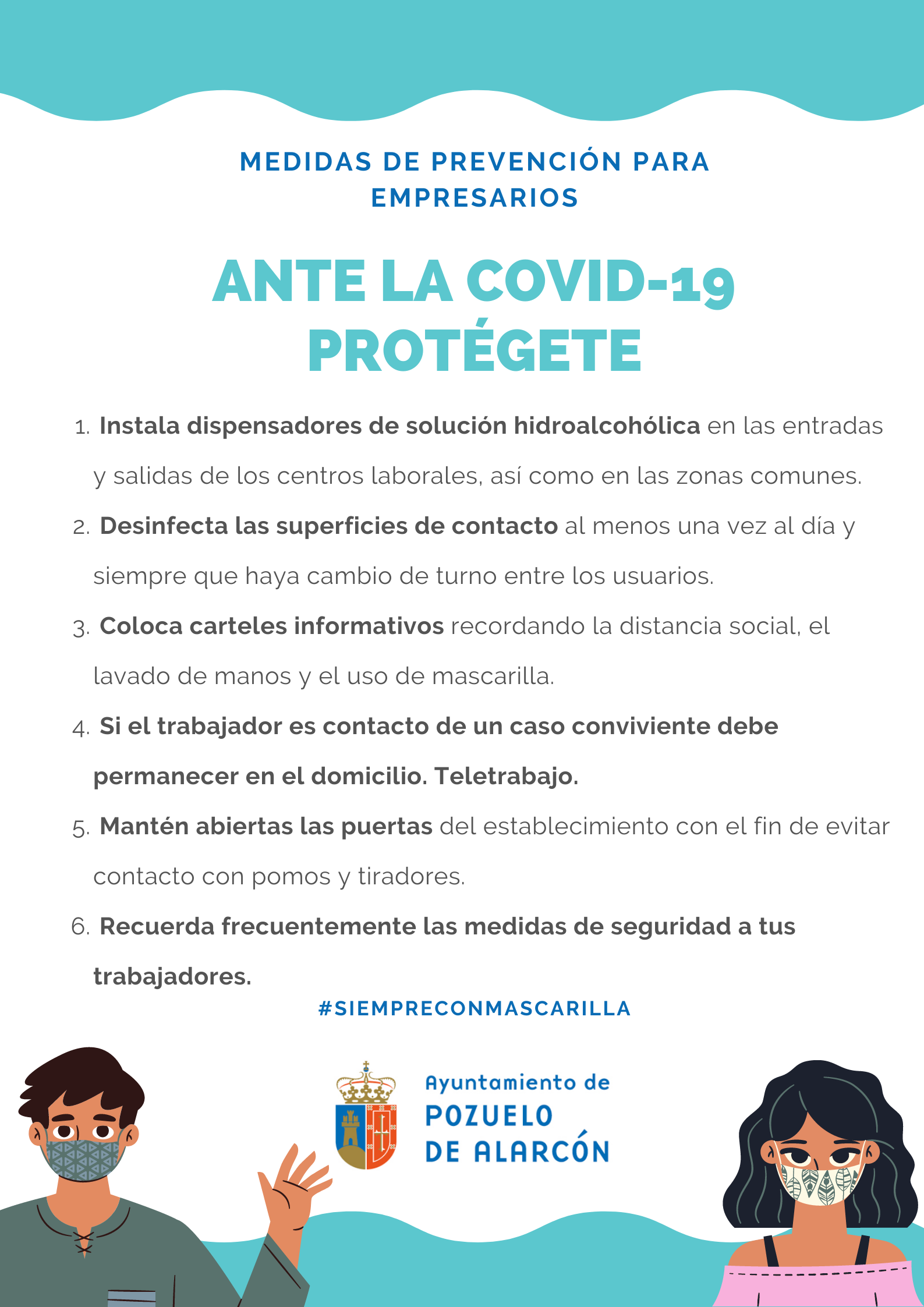 Así, se recuerda que los empresarios deberán instalar dispensadores de solución hidroalcohólica en las entradas y salidas de los centros laborales y en las zonas comunes. Desinfectar las superficies de contacto al menos una vez al día, colocar carteles informativos recordando la distancia social, el lavado de manos y el uso de las mascarillas, son otras de las medidas. Asimismo, si el trabajador es contacto de un caso conviviente debe permanecer en el domicilio (teletrabajo). Otras de las recomendaciones es mantener abiertas las puertas del establecimiento con el fin de evitar el contacto con pomos y tiradores y recordar frecuentemente las medidas de seguridad a los trabajadores.