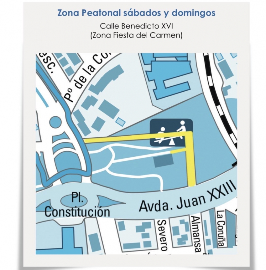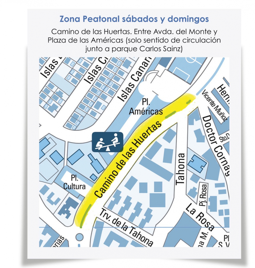 - La peatonalización de estos espacios llega este fin de semana a Camino de las Huertas - entre Avda. del Monte y Plaza de las Américas (en el sentido de circulación más próximo al parque Carlos Sainz) - y Benedicto XVI, desde las 7 horas y hasta el domingo, a las 23 horas.