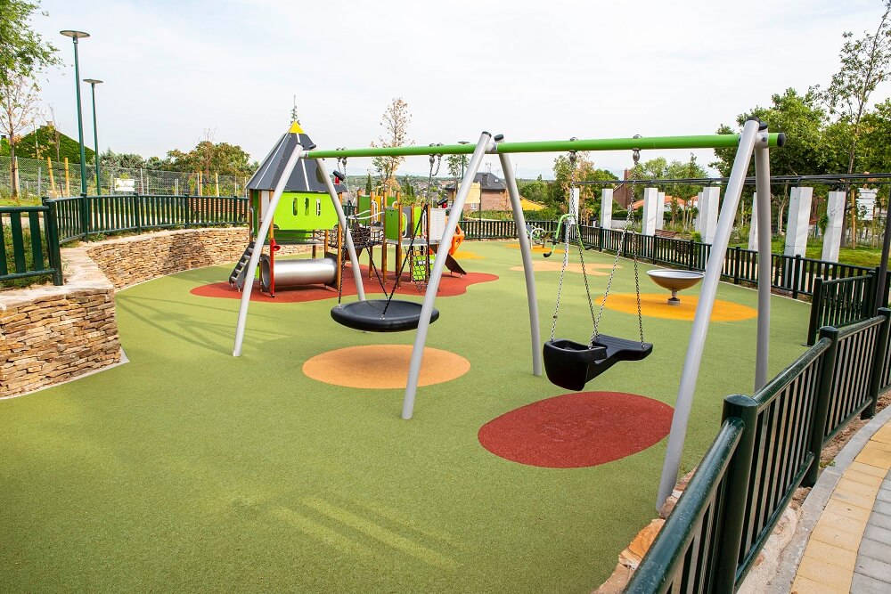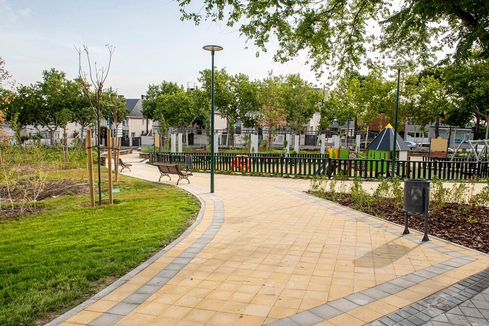 Así, el parque, en el que se han plantado árboles como robles de Turquía, cinamomos o perales de flor y más de 4.000 unidades de arbustos como el romero, hiedra, lavanda, abelias o fotinias, cuenta con zonas estanciales, dos pérgolas de forja metálica, y una gran área de juego infantil de casi 300 m2 con seis estructuras de juego para niños de 2 a 12 años.